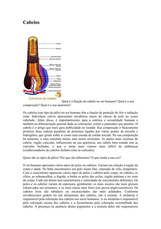 O documento discute a função, composição e anatomia dos cabelos humanos. Os cabelos protegem contra o frio e radiação solar e são importantes para a estética e identidade humanas. Eles são compostos principalmente de proteínas ligadas por enxofre e hidrogênio. Os folículos pilosos, dos quais existem cerca de 120.000 no couro cabeludo, são responsáveis pelo crescimento dos cabelos em um ciclo contínuo.