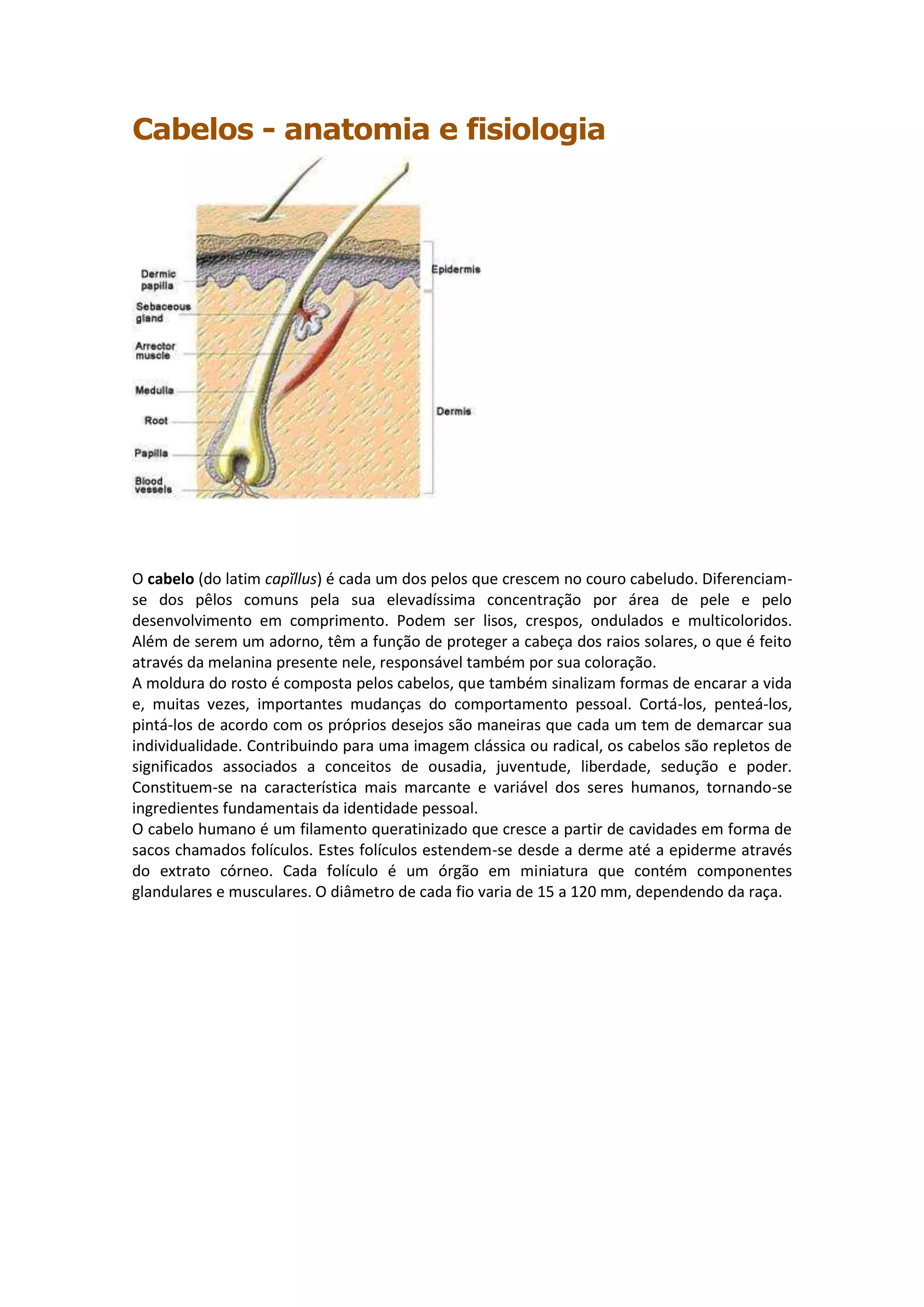 O documento descreve a anatomia e fisiologia dos cabelos humanos. Os cabelos são filamentos queratinizados que crescem nos folículos capilares localizados na derme. Cada fio de cabelo possui três camadas - cutícula, córtex e medula - e passa por diferentes fases de crescimento. A cor dos cabelos é determinada pela quantidade e tipo de melanina presente no córtex.