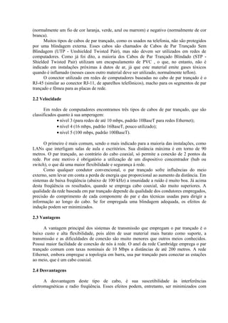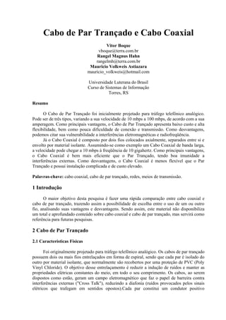 O documento faz uma comparação entre cabo de par trançado e cabo coaxial, descrevendo suas características, vantagens e desvantagens. O cabo de par trançado possui baixo custo e flexibilidade, mas é vulnerável a interferências. O cabo coaxial permite maiores velocidades, mas tem instalação mais cara e é menos flexível. Ambos têm aplicações diferentes dependendo da distância e localização.