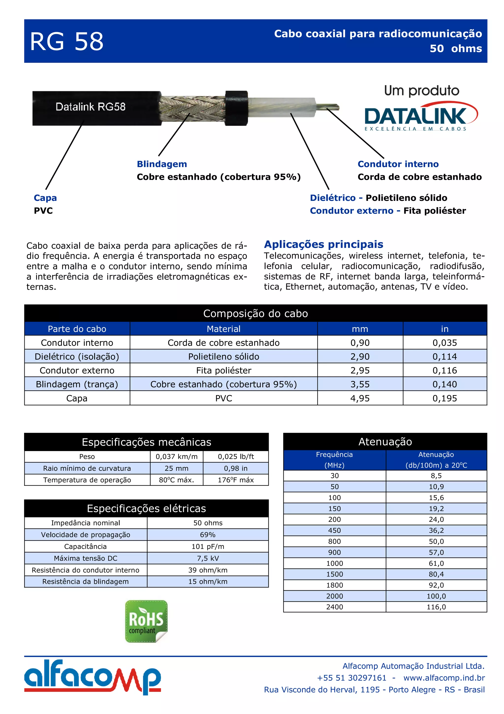 Este documento descreve um cabo coaxial RG-58 de 50 ohms para aplicações de rádio frequência. Ele possui um condutor interno de cobre estanhado isolado por polietileno sólido e blindado por uma malha de cobre estanhado recoberta por PVC. Fornece especificações técnicas como atenuação, impedância, capacitância e temperatura de operação para aplicações como telecomunicações, wireless e radiodifusão.