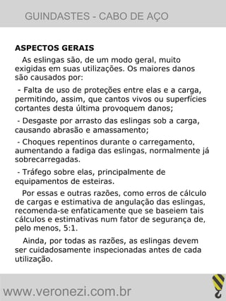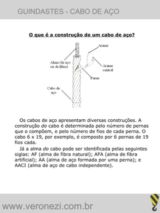 O documento discute os aspectos gerais do uso de cabos de aço em guindastes, incluindo a importância de inspeções regulares e fatores de segurança adequados para evitar danos. Também aborda tópicos como a construção, diâmetro, lubrificação e distorções comuns em cabos de aço.
