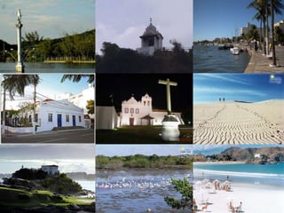O documento lista e descreve os principais pontos turísticos de Cabo Frio, como o Charitas, Forte São Mateus, Capela Nossa Senhora da Guia, igrejas, Teatro Municipal, Canal do Itajurú, dunas, Dormitório das Garças, Fonte do Itajurú, Anjo Caído, praias e a Rua dos Biquínis.