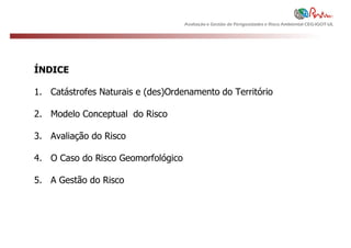 Este documento apresenta um seminário internacional sobre cartografia e geosedia, com foco na avaliação e gestão de perigosidades e risco ambiental. O seminário aborda tópicos como catástrofes naturais e ordenamento do território, modelo conceitual de risco, avaliação de risco, risco geomorfológico e gestão de risco. Métodos como inventários, identificação de fatores de predisposição e modelos preditivos são discutidos no contexto da avaliação de risco e cartografia de risco.