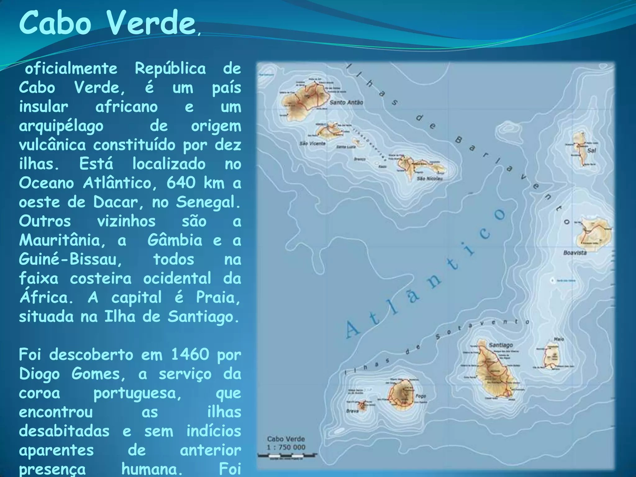 Cabo Verde é um arquipélago africano constituído por 10 ilhas de origem vulcânica localizado no Oceano Atlântico a oeste do Senegal. A capital e maior cidade é Praia na ilha de Santiago. Foi descoberto por Portugal em 1460 e colonizado, tornando-se independente em 1975.