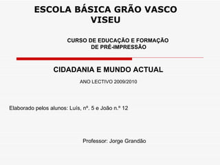 ESCOLA BÁSICA GRÃOVASCO VISEU CURSO DE EDUCAÇÃO E FORMAÇÃO DE PRÉ-IMPRESSÃO CIDADANIA E MUNDO ACTUAL ANO LECTIVO 2009/2010 Elaborado pelos alunos: Luís, nº. 5 e João n.º 12 Professor: Jorge Grandão