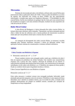 O documento descreve diferentes tipos de cabos de transmissão, incluindo cabos coaxiais, guias de onda e fibra ótica. Cabos coaxiais como os Heliax são adequados para comunicações celulares, rádio e microondas, enquanto guias de onda elípticos e retangulares são usados em sistemas de microondas. A fibra ótica, composta de vidro puro, permite a transmissão de luz a altas velocidades e é usada em prédios e túneis.