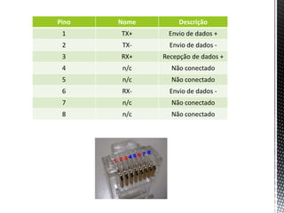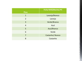 O documento descreve os passos para conectar um cabo de rede UTP categoria 5e em uma ficha RJ45. Inclui descrição dos materiais necessários e dos procedimentos de separar os pares do cabo, organizá-los corretamente e cravar na ficha RJ45. Também fornece detalhes sobre as diferentes categorias de cabos UTP, suas velocidades de transmissão suportadas e larguras de banda.