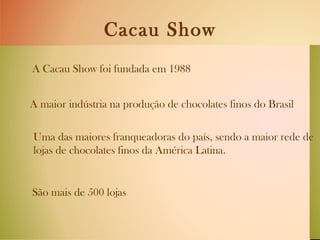 A Cacau Show está comemorando 20 anos de sucesso e planeja uma campanha publicitária de 4 meses para divulgar a marca. A campanha usará marketing promocional, relacionamento e trade marketing em diversos meios, incluindo TV, internet, impressos e ponto de venda, com o objetivo de posicionar a marca e aumentar vendas.