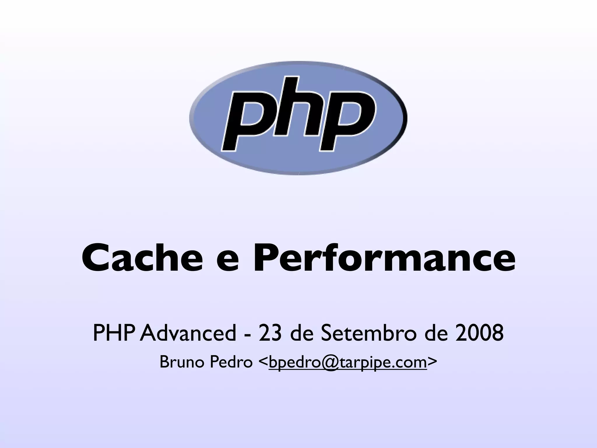Este documento discute várias técnicas para melhorar o desempenho de aplicações PHP, incluindo arquitetura, profiling, benchmarking, cache, compressão e compilação de código. A arquitetura define como o sistema se comporta e afeta a escalabilidade e desempenho. Profiling e benchmarking medem tempos de execução e uso de memória para identificar gargalos. Cache grava conteúdo dinâmico staticamente para melhorar a performance. Compressão economiza largura de banda. Compilação converte código PHP em opcodes para execução