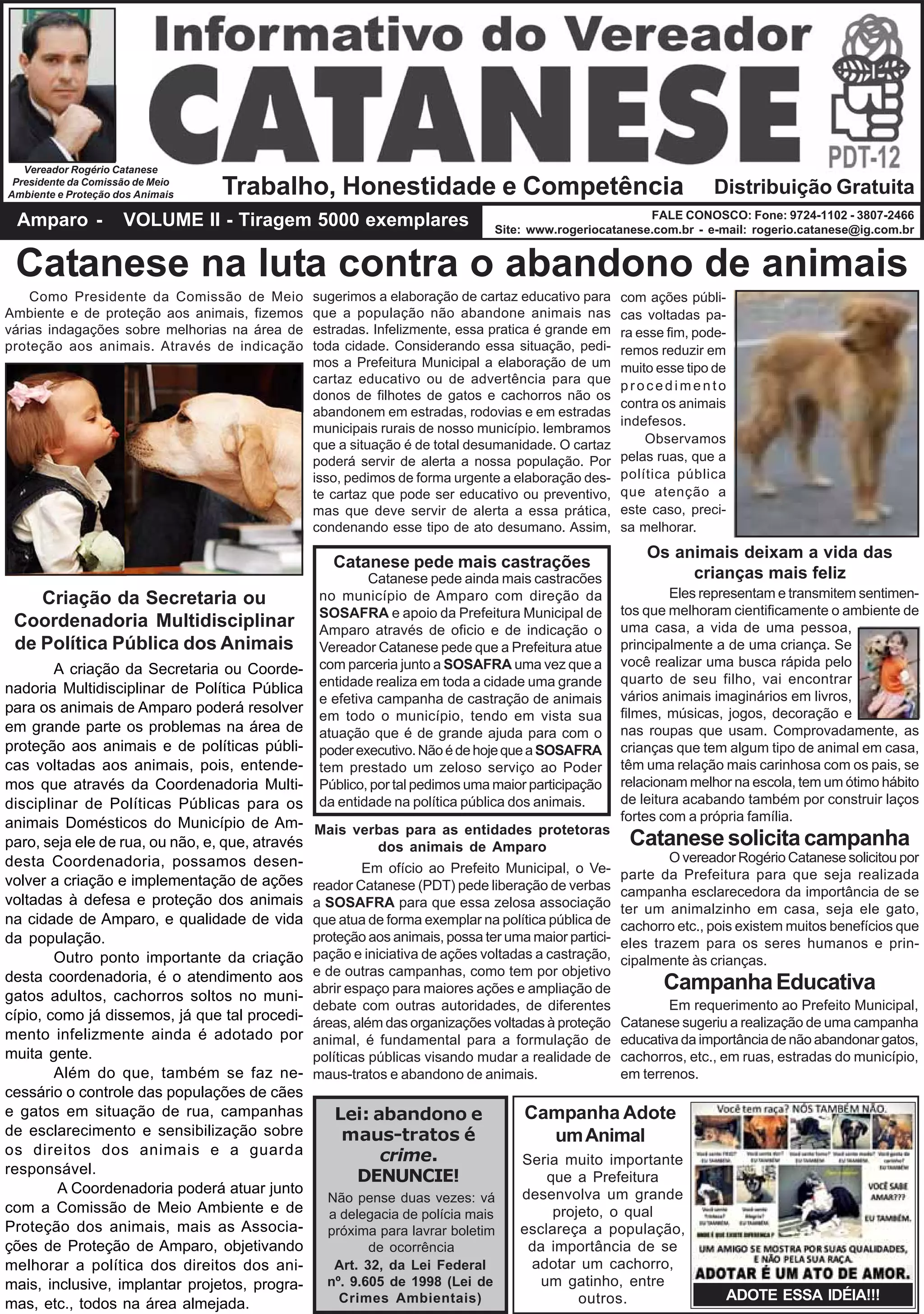 O vereador Rogério Catanese propõe a criação de uma Secretaria ou Coordenadoria Multidisciplinar de Política Pública para os Animais em Amparo para melhorar a proteção aos animais e políticas públicas relacionadas através de ações como castrações e campanhas educativas. Ele também solicita mais verbas para as entidades protetoras dos animais e uma campanha sobre os benefícios de se ter animais, principalmente para as crianças.