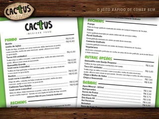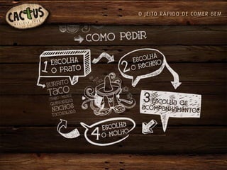 A CactusMexicanFood foi criada em 2009 por empresários americanos com o conceito de "gourmet rápido" e modelo fast food de qualidade. No primeiro ano, investidores compraram a ideia e iniciaram franquias. O documento descreve o público-alvo, cardápio, sucesso do franchising, padrão das lojas, suporte aos franqueados e detalhes sobre investimento inicial.