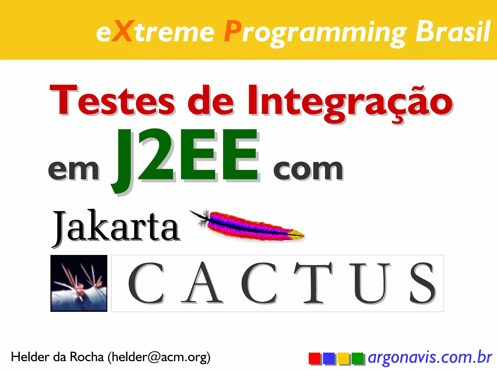 O documento discute testes de integração em aplicações J2EE usando o framework Cactus. Ele apresenta o Cactus e mostra como utilizá-lo para testar servlets, EJBs e integração com outros frameworks como HttpUnit e JUnitEE.