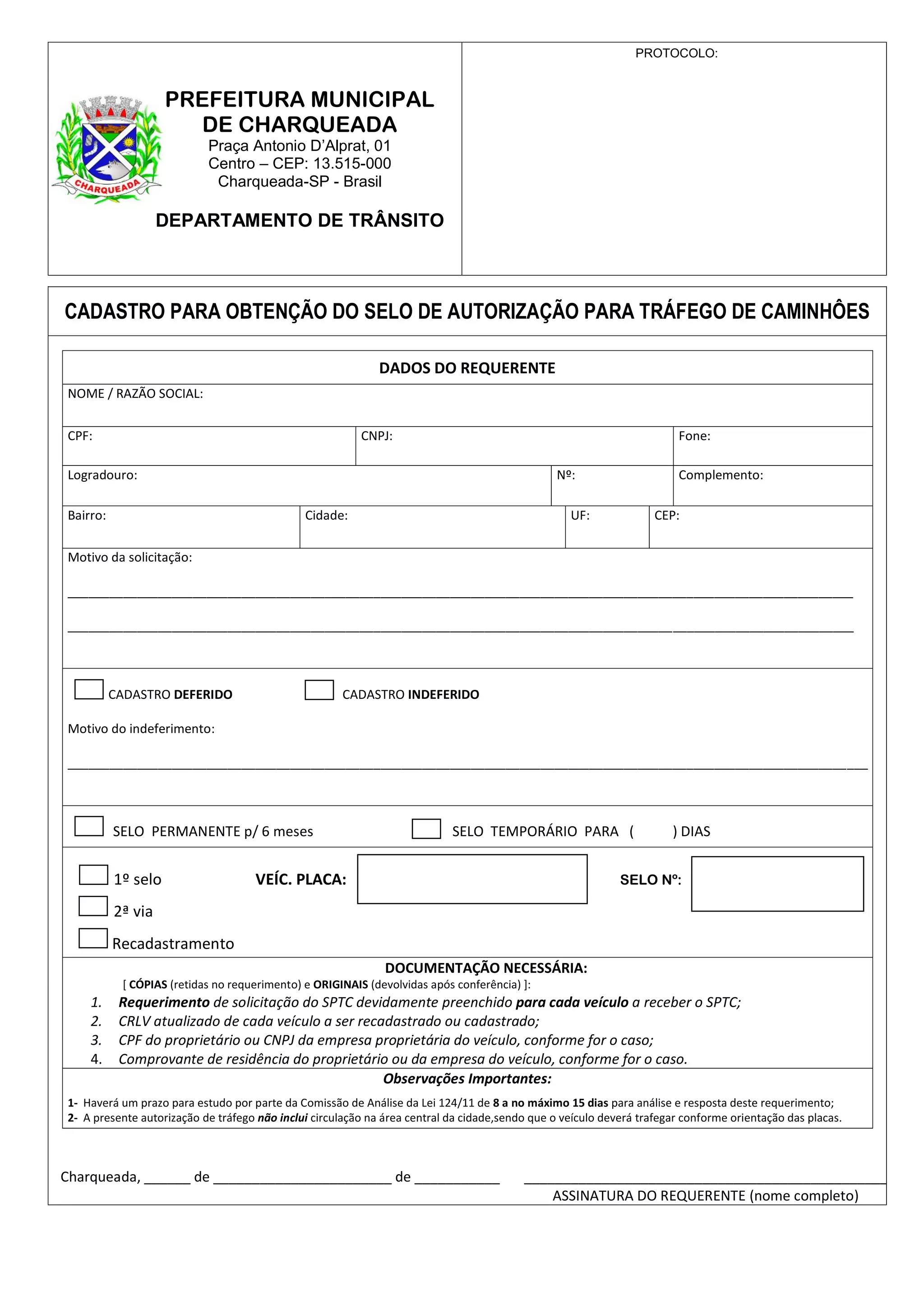 O documento é um protocolo da prefeitura de Charqueada para solicitação de selo de autorização para tráfego de caminhões. Ele detalha os dados do requerente, a documentação necessária e informações sobre prazos e restrições de tráfego. A autorização é analisada por uma comissão e não permite a circulação na área central da cidade.