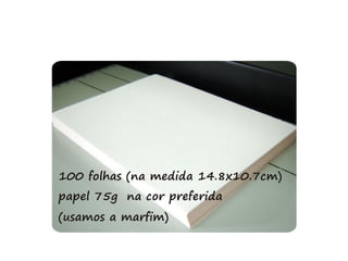 Este documento fornece instruções passo-a-passo para fazer uma capa decorada e um caderno de anotações usando materiais reciclados. Ele explica como recortar, colar e decorar as capas dianteira e traseira com tecidos e papéis coloridos, e como adicionar detalhes como uma boneca e um gato. Também mostra como furar e encadernar as folhas para formar o caderno completo.