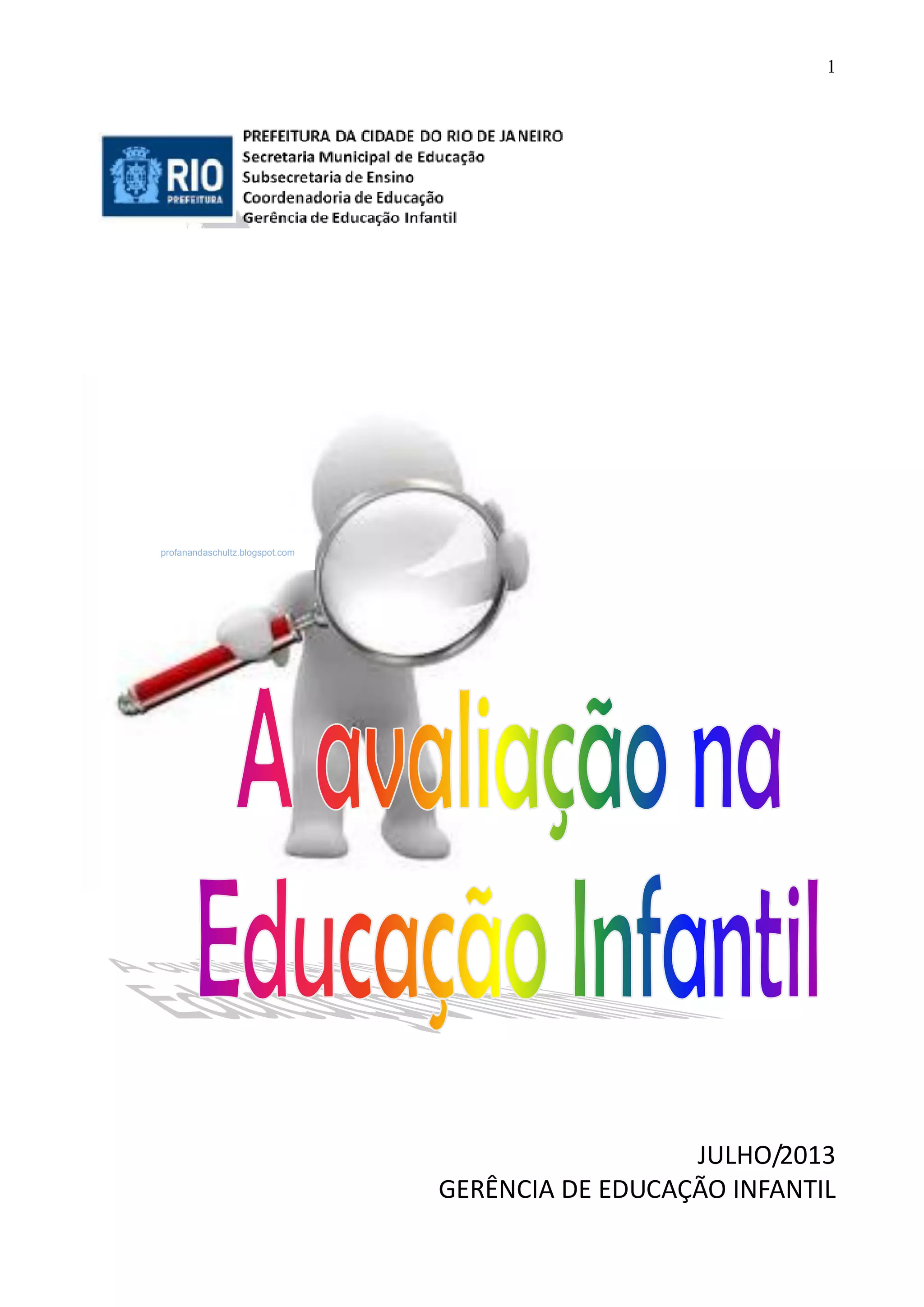 Este documento discute a avaliação na educação infantil no contexto da rede municipal de educação do Rio de Janeiro. Ele apresenta a equipe gestora da educação infantil e discute a importância da avaliação para acompanhar o desenvolvimento infantil de forma integrada. O documento também analisa como a avaliação deve ser planejada e discutida pela equipe, levando em conta diversos aspectos do desenvolvimento da criança.