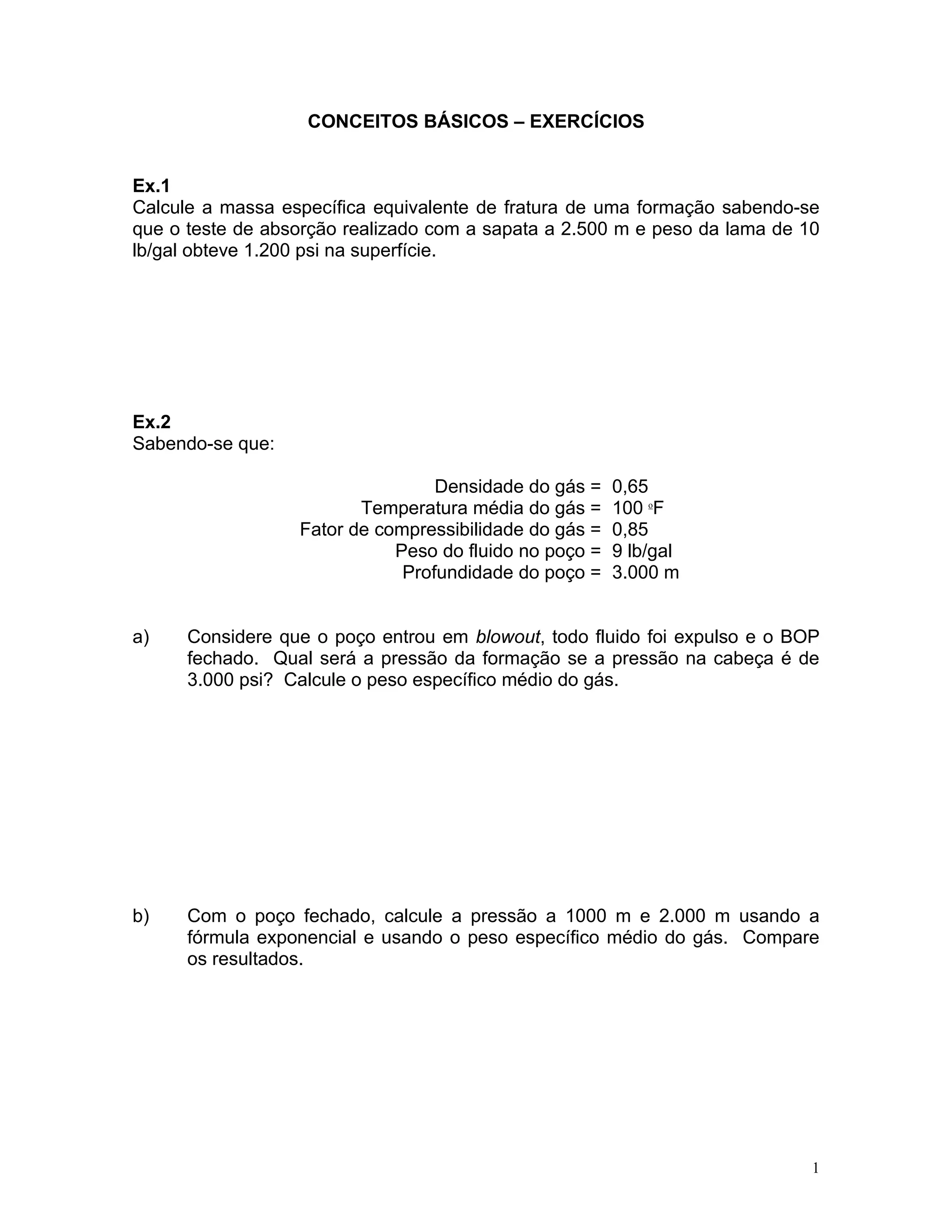 2) Os exercícios envolvem cálculos de pressão, peso específico e volume de fluidos em poços de petróleo.