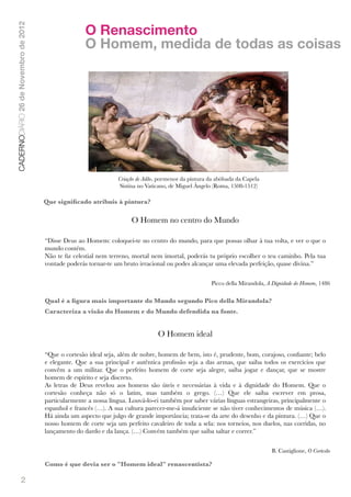 O documento descreve a abertura da Europa ao mundo nos séculos XV e XVI através do Renascimento. O Renascimento promoveu o individualismo e valorizou o Homem como medida de todas as coisas. A educação humanista e a experiência direta passaram a ser valorizadas. As artes renascentistas como a pintura, escultura e arquitetura valorizaram a figura humana e a racionalidade das composições.