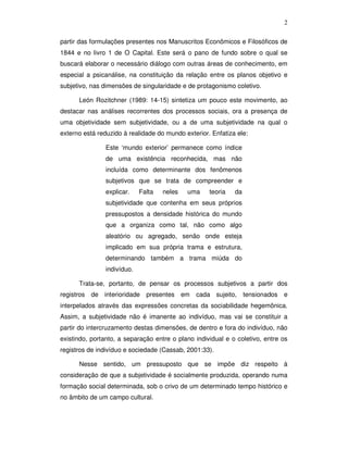 1) O documento discute a temática da subjetividade no marxismo e como a subjetividade é socialmente produzida sob determinadas condições históricas e sociais.