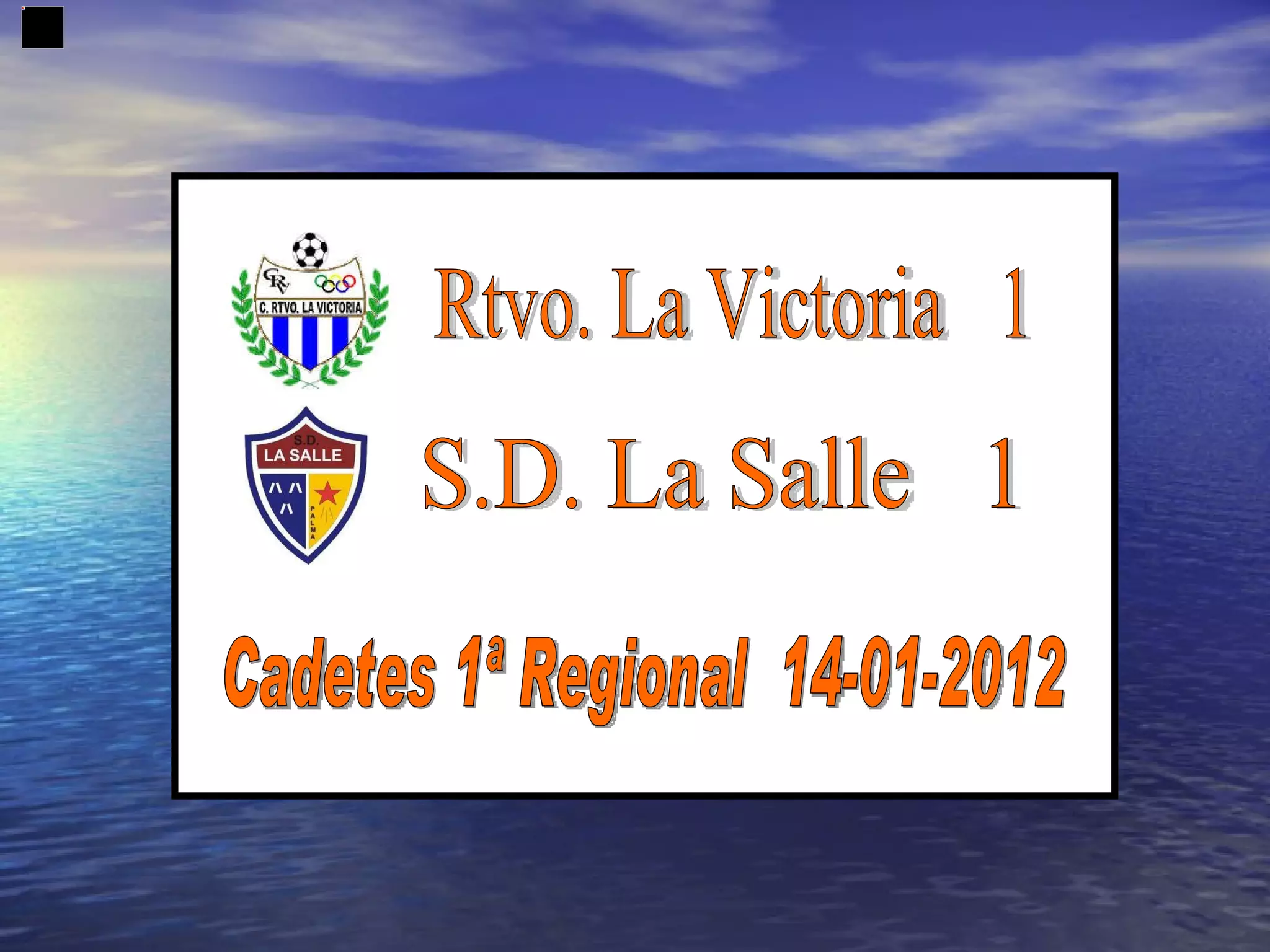 O documento relata um jogo de futebol entre as equipes Rtvo. La Victoria e S.D. La Salle na categoria Cadetes pela 1a Regional em 14 de janeiro de 2012, com vitória de Rtvo. La Victoria por 1 a 0.