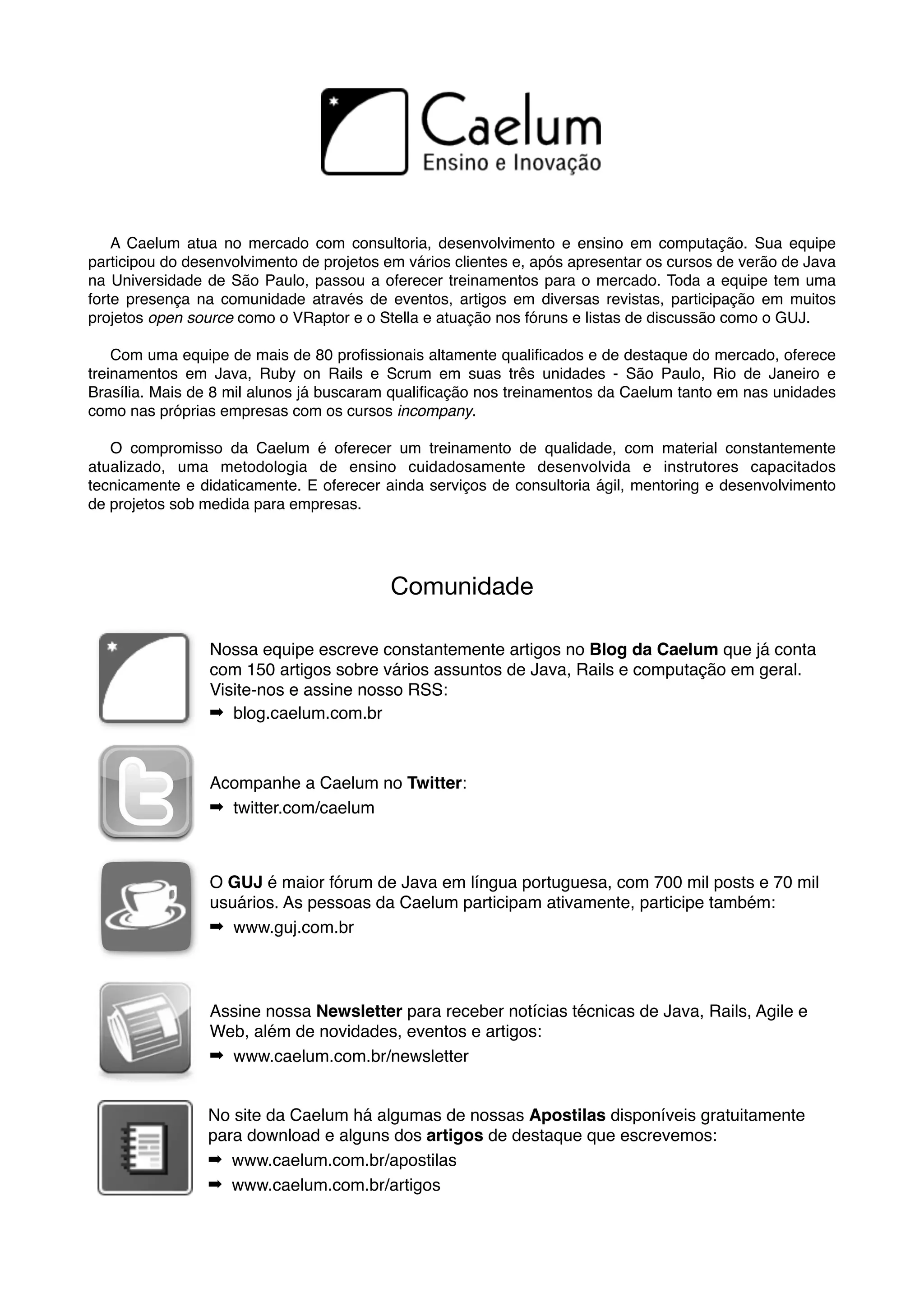1. A Caelum é uma empresa de consultoria, treinamento e ensino em computação com foco em Java, Ruby on Rails e Scrum.