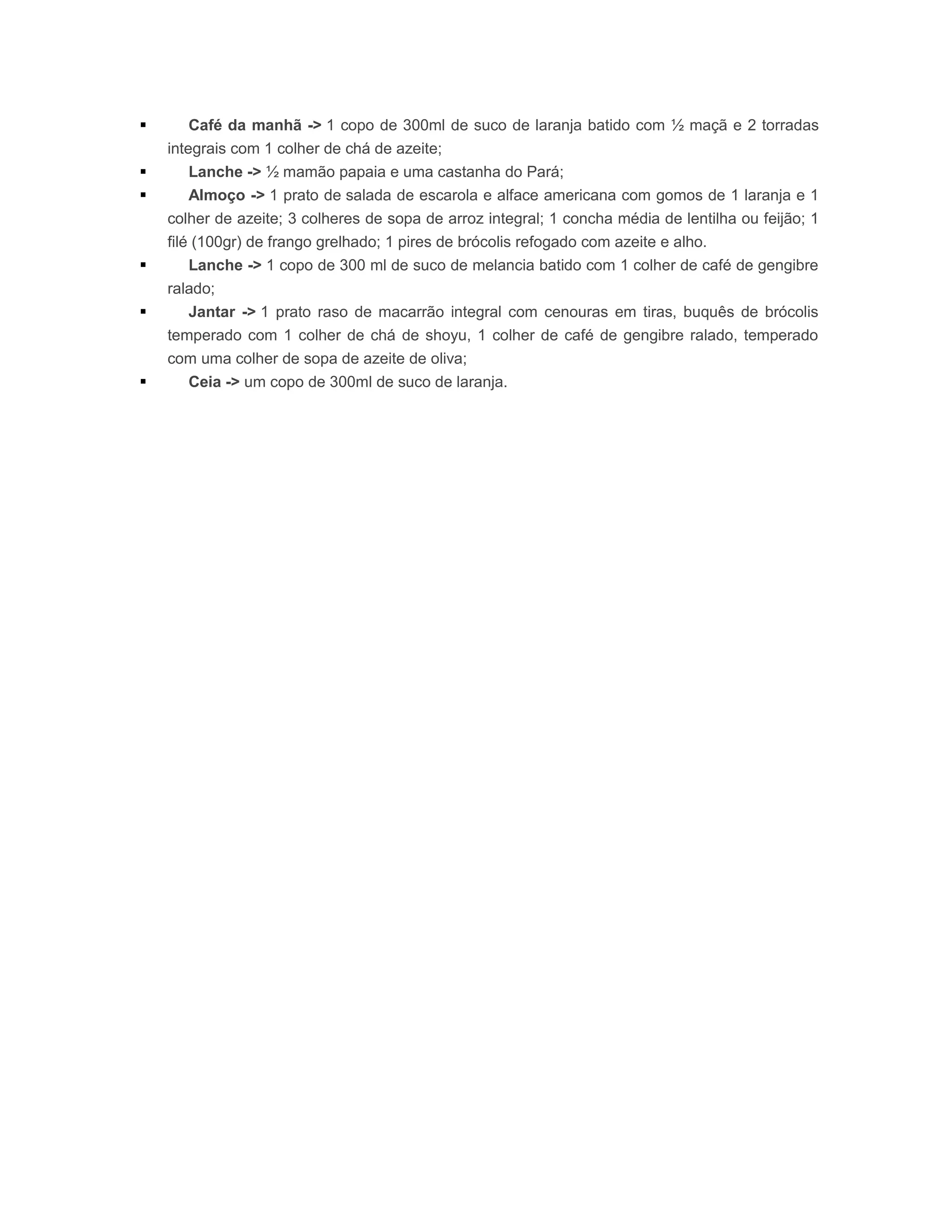 O documento descreve a dieta de um dia, incluindo café da manhã com suco de laranja, maçã e torradas integrais com azeite, almoço com salada, arroz, lentilha, frango e brócolis, e jantar com macarrão integral, cenoura e brócolis temperado com shoyu e gengibre.