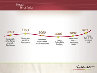 O documento descreve a missão, visão e valores do Café do Pátio, uma rede de serviços de alimentação com 19 anos de experiência. Destaca os diversos locais e formatos do serviço, incluindo buffets self-service e almoços executivos, enfatizando a qualidade dos alimentos e atendimento personalizado. O restaurante é certificado em segurança alimentar e prioriza a seleção rigorosa de ingredientes frescos, oferecendo uma variedade de opções saudáveis e criativas.
