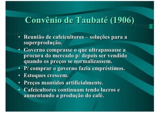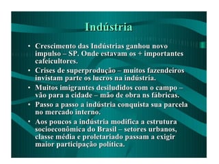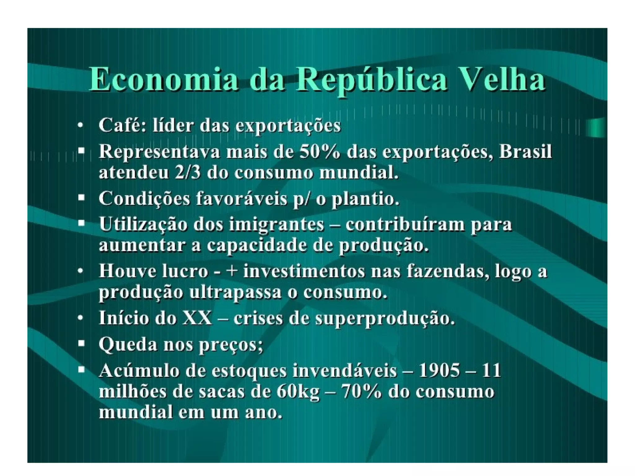 A produção de café superou o consumo na década de 1890, causando uma crise. Enquanto alguns cafeicultores continuaram investindo em café, outros procuraram investir em indústrias para diversificar a economia. Isto explica porque São Paulo se tornou o estado mais industrializado do Brasil, com o número de indústrias e operários aumentando entre 1907 e 1920.