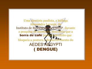 Uma pesquisadora descobriu que a borra de café inibe o desenvolvimento do mosquito da dengue. Colocando borra de café em recipientes com água parada, como vasos e bromélias, ela bloqueia a postura e desenvolvimento das larvas do mosquito de forma natural e barata. A borra de café altera enzimas do mosquito e reduz seu tempo de vida. A solução é fácil de preparar e pode ajudar no combate à dengue de forma ecológica.