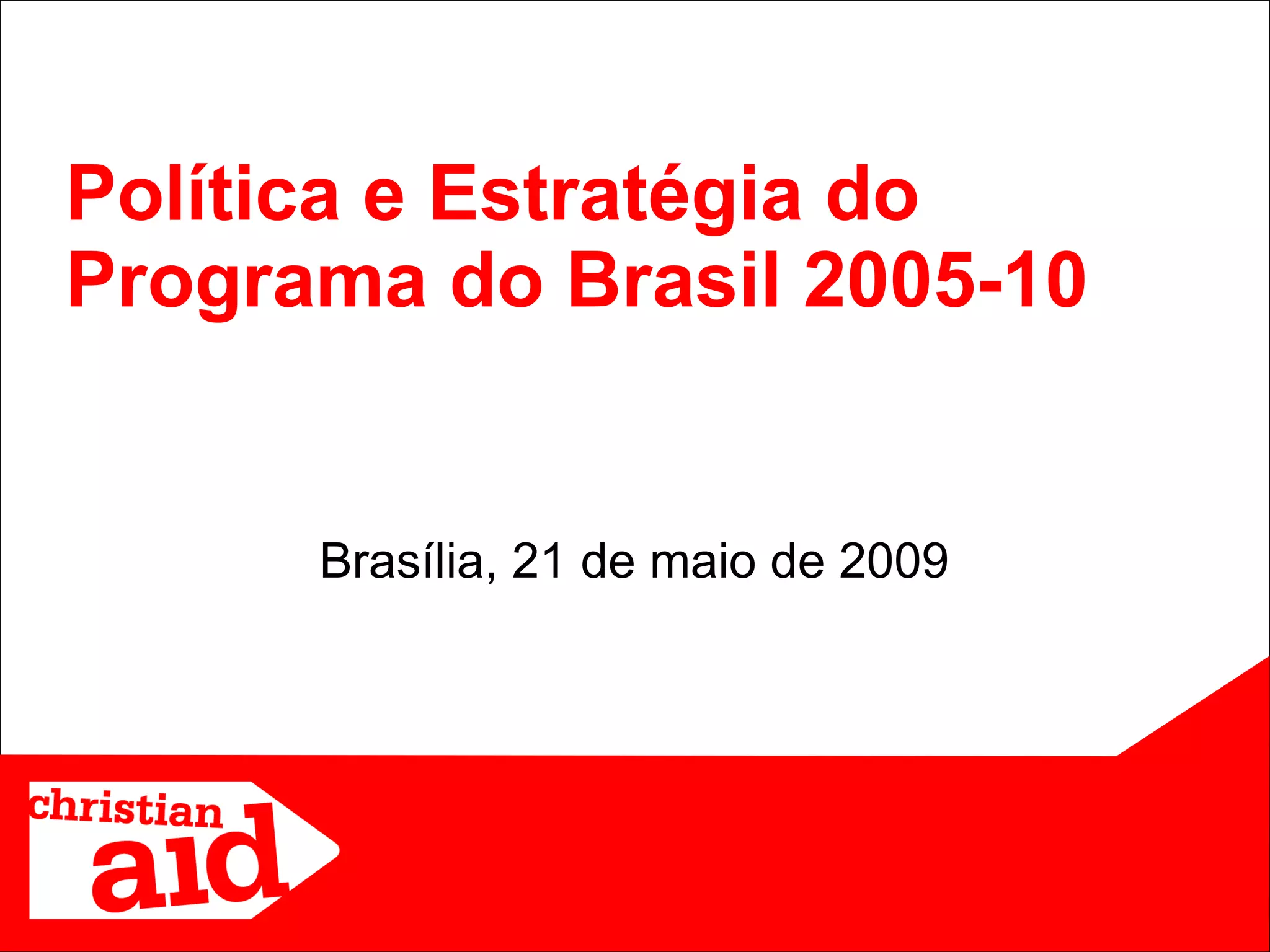 Este documento descreve o objetivo e estratégia do Programa do Brasil da Christian Aid para 2005-2010. Seu objetivo geral era promover os direitos humanos e reduzir desigualdades sociais, focando em quatro áreas: governança e participação cidadã, justiça econômica, garantia de meios de sustento e HIV/AIDS. O programa visava fortalecer movimentos sociais e pressionar por políticas inclusivas.