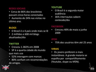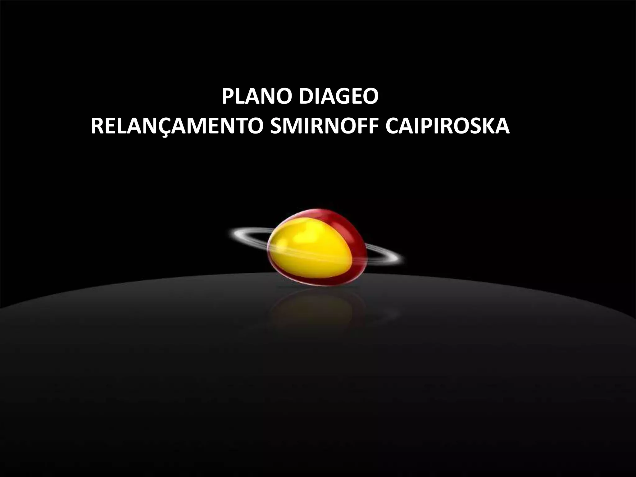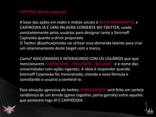 O documento descreve o plano de relançamento da Smirnoff Caipiroska nos mercados de São Paulo e Belo Horizonte entre setembro de 2010 e junho de 2011. A estratégia inclui a criação de um jogo interativo chamado "Game Together Já é Caipiroska" para promover a degustação do produto em encontros entre amigos, além de uma festa de lançamento com o influenciador Marcelo Adnet.