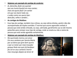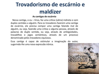Este documento descreve dois tipos de cantigas de trovadores medievais: cantigas de escárnio, que faziam críticas indiretas através de duplo sentido, e cantigas de maldizer, que traziam críticas diretas e agressivas, possivelmente usando palavrões. Exemplos de cada tipo de cantiga são fornecidos para ilustrar suas características.
