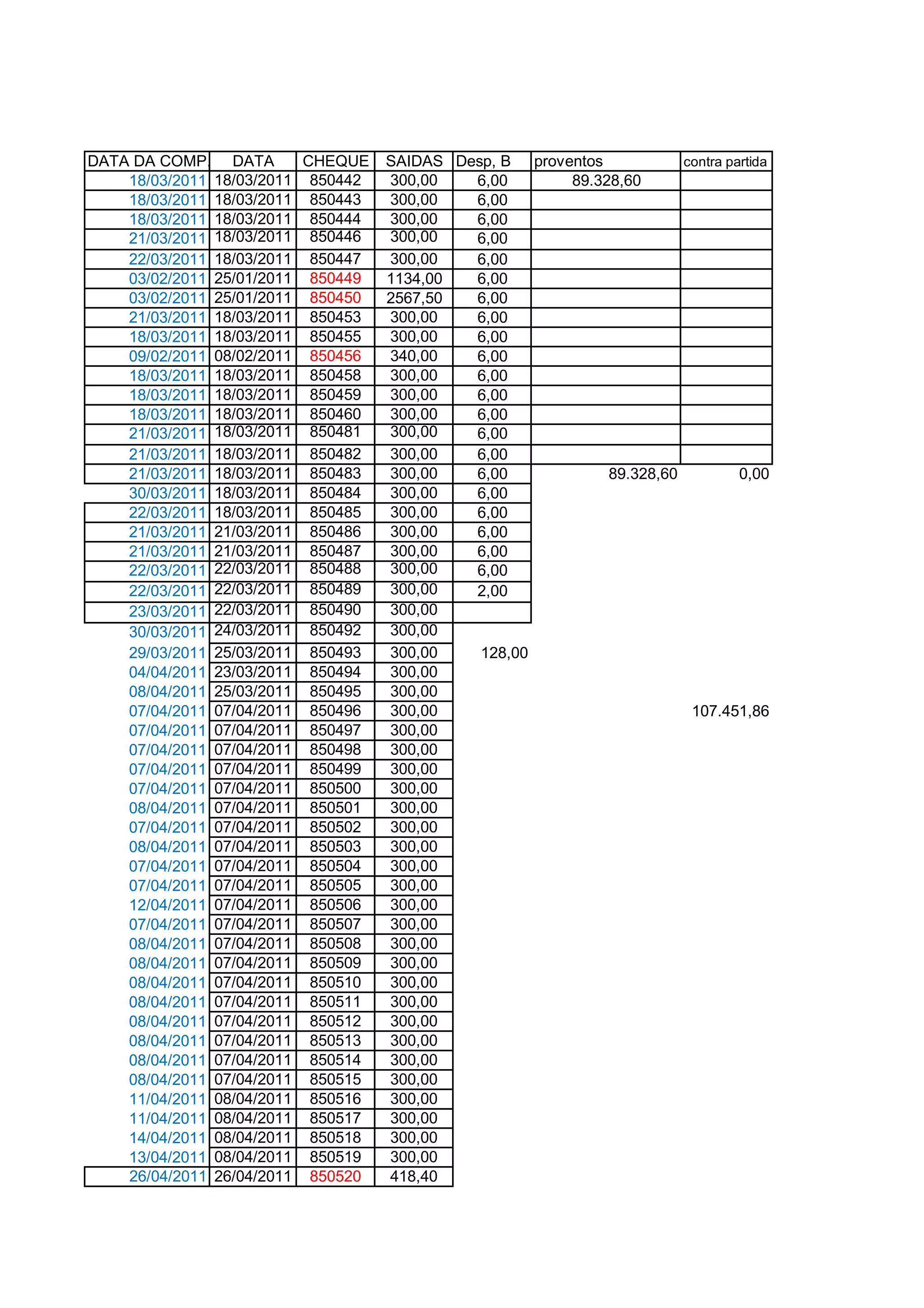 O documento lista transações financeiras realizadas entre janeiro e outubro de 2011, incluindo datas, números de cheques e valores. As transações variam de R$300 a R$3.500 e parecem ser pagamentos regulares realizados pela empresa.