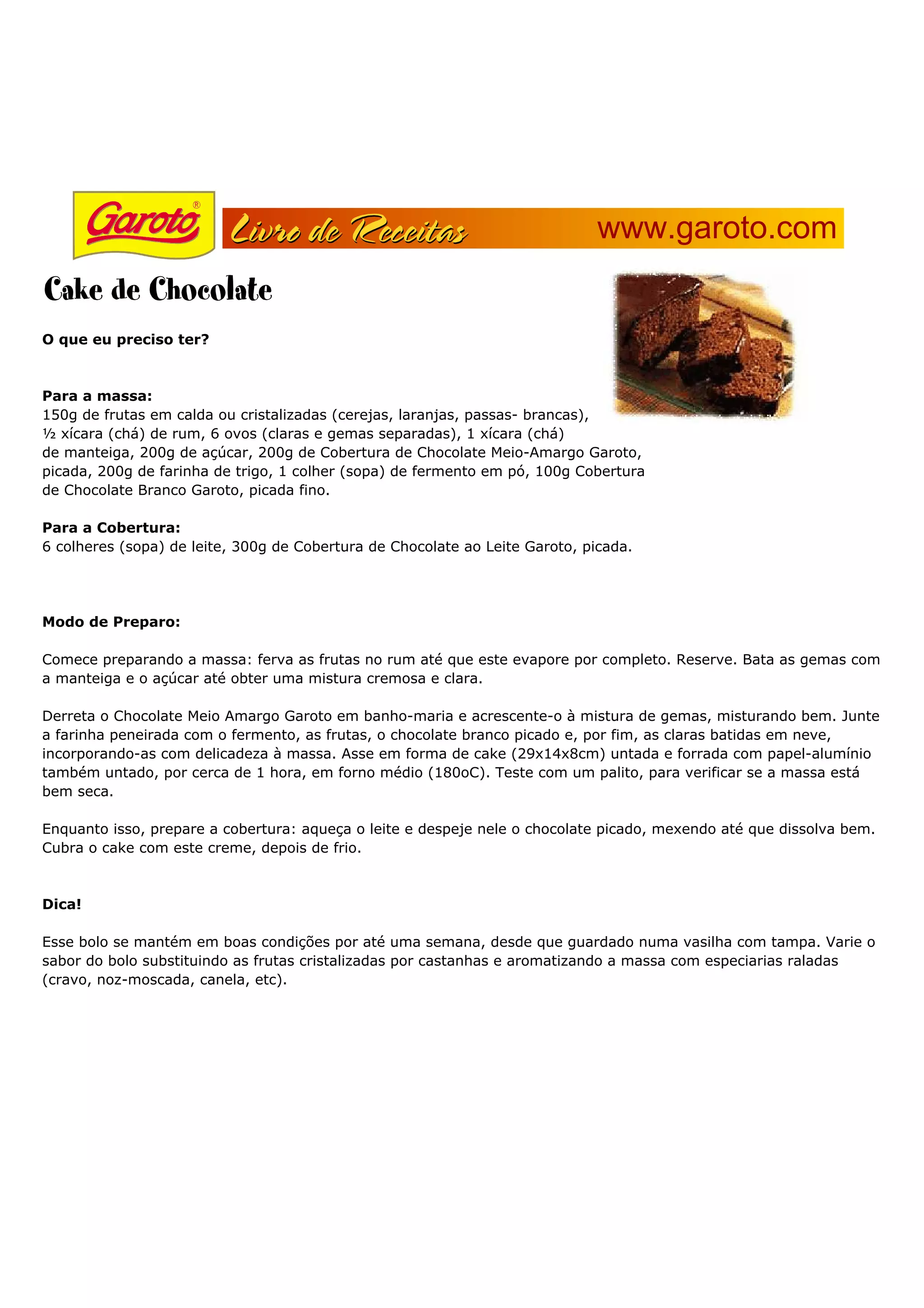 O documento fornece uma receita de bolo de frutas cristalizadas com cobertura de chocolate. A receita inclui instruções para preparar a massa com frutas cristalizadas, ovos, manteiga, açúcar e chocolate e para fazer a cobertura de chocolate ao leite. O bolo é assado em forma untada por cerca de 1 hora e depois coberto com a cobertura de chocolate.