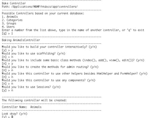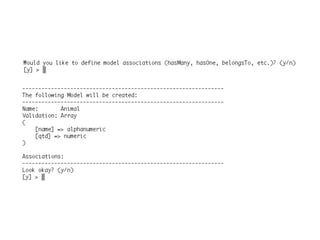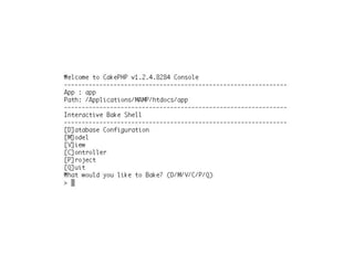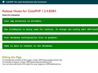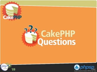 O documento descreve o framework PHP CakePHP. Ele fornece um resumo sobre o que é CakePHP, quem o está usando e por que estão usando, além de abordar tópicos como MVC, ORM, validação, internacionalização e rotas.