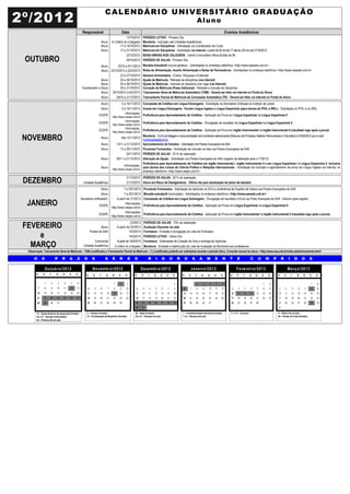 O documento apresenta o calendário acadêmico da graduação para o período de outubro de 2012 a março de 2013, com as datas importantes para matrícula, trancamento, monitoria, aproveitamento de créditos e formatura. Inclui também os feriados e recessos no período.
