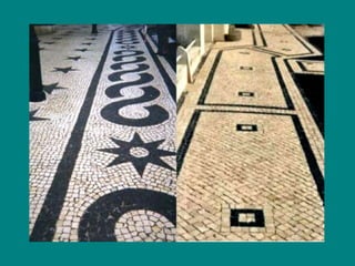 A calçada portuguesa, ou mosaico português, é um tipo tradicional de revestimento de piso, utilizado principalmente em calçadas e espaços públicos, feito de pedras irregulares, geralmente calcárias e basálticas, que permitem a criação de padrões decorativos. Surgida em Portugal no século XIX, essa arte é executada por mestres calceteiros e tem sua presença expandida em diversos países após a Expo 98. As cores mais comuns são branco e preto, mas também são usadas outras como castanho e vermelho, refletindo a diversidade cultural e estética desse mosaico.