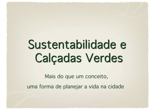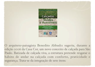 A calçada viva é um conceito proposto para melhorar a mobilidade e qualidade de vida nos espaços públicos de São Paulo, integrando sete itens: calçadas acessíveis, culturais, mobiliadas, verdes, ecológicas e inteligentes e saudáveis. O documento discute como esses elementos podem ser implementados de forma sustentável do ponto de vista ecológico, social e econômico.