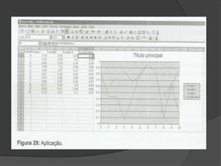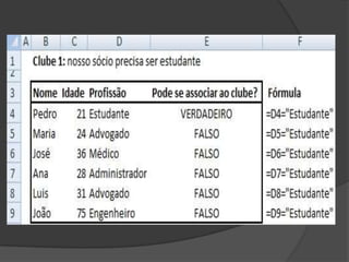 O documento apresenta funções estatísticas e lógicas do Excel, incluindo: