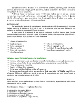 O documento discute o mineral cálcio, seu papel fundamental na construção e manutenção de ossos e dentes, e fontes alimentares ricas em cálcio. Uma deficiência de cálcio pode levar a problemas ósseos como raquitismo e osteoporose, enquanto um excesso pode causar hipercalcemia. O documento fornece recomendações para prevenir a osteoporose através de uma dieta equilibrada e atividade física.