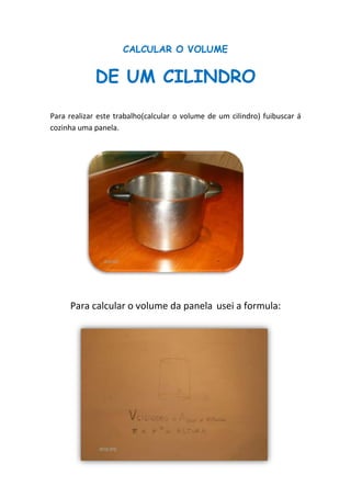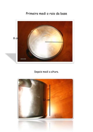 O documento ensina como calcular o volume de uma panela cilíndrica usando sua fórmula. Ele mede o raio da base da panela como 8 cm e sua altura como 12 cm, e calcula o volume usando a fórmula como π × raio2 × altura, resultando em 2412.74 cm3.