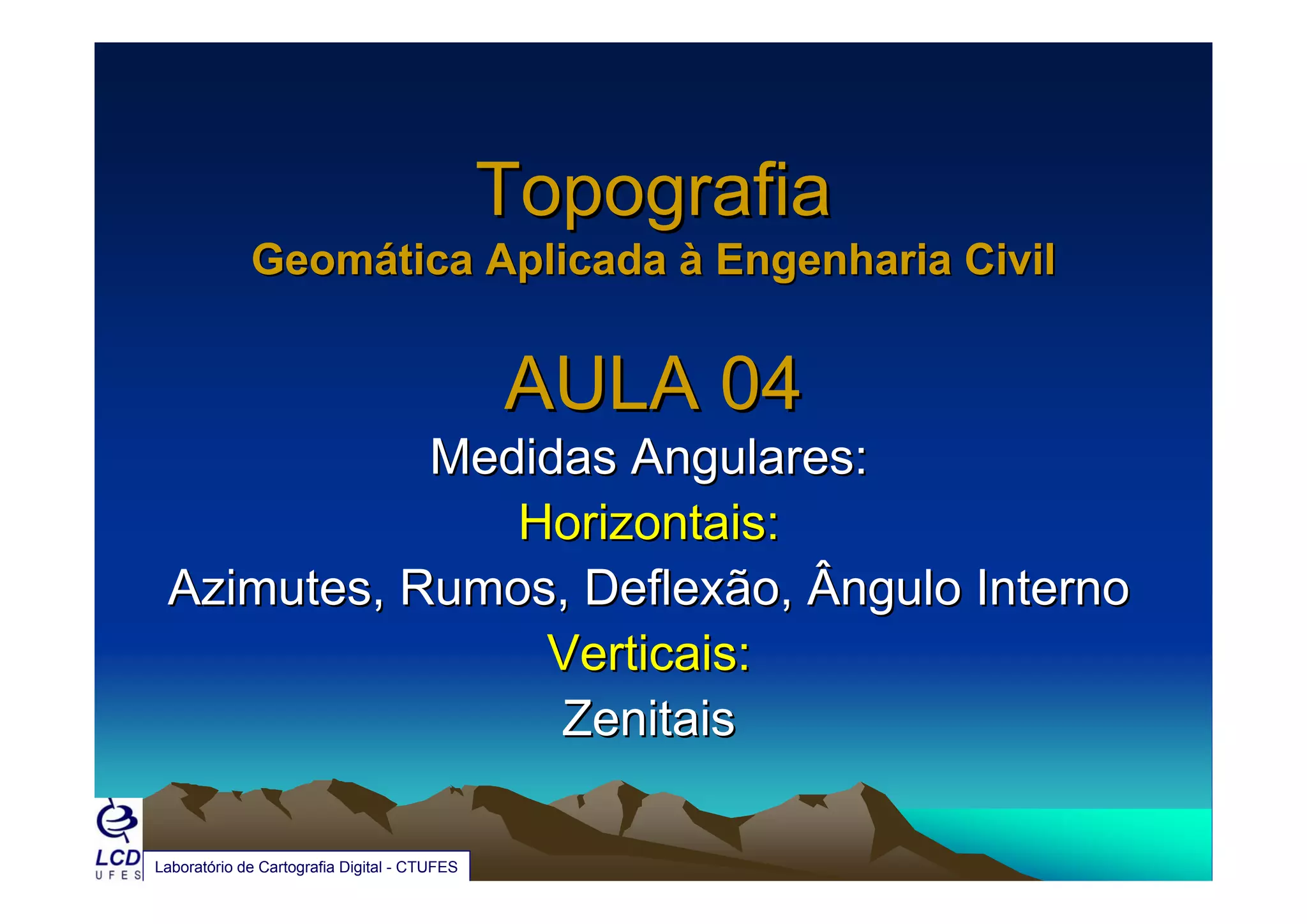 O documento descreve conceitos de medidas angulares utilizadas em topografia, incluindo ângulos horizontais como azimutes, rumos e deflexão e ângulos verticais como o zenital. É apresentado como medir e calcular esses diferentes tipos de ângulos e como converter entre azimutes e rumos. Exemplos ilustram como transportar azimutes ao longo de uma poligonal topográfica.