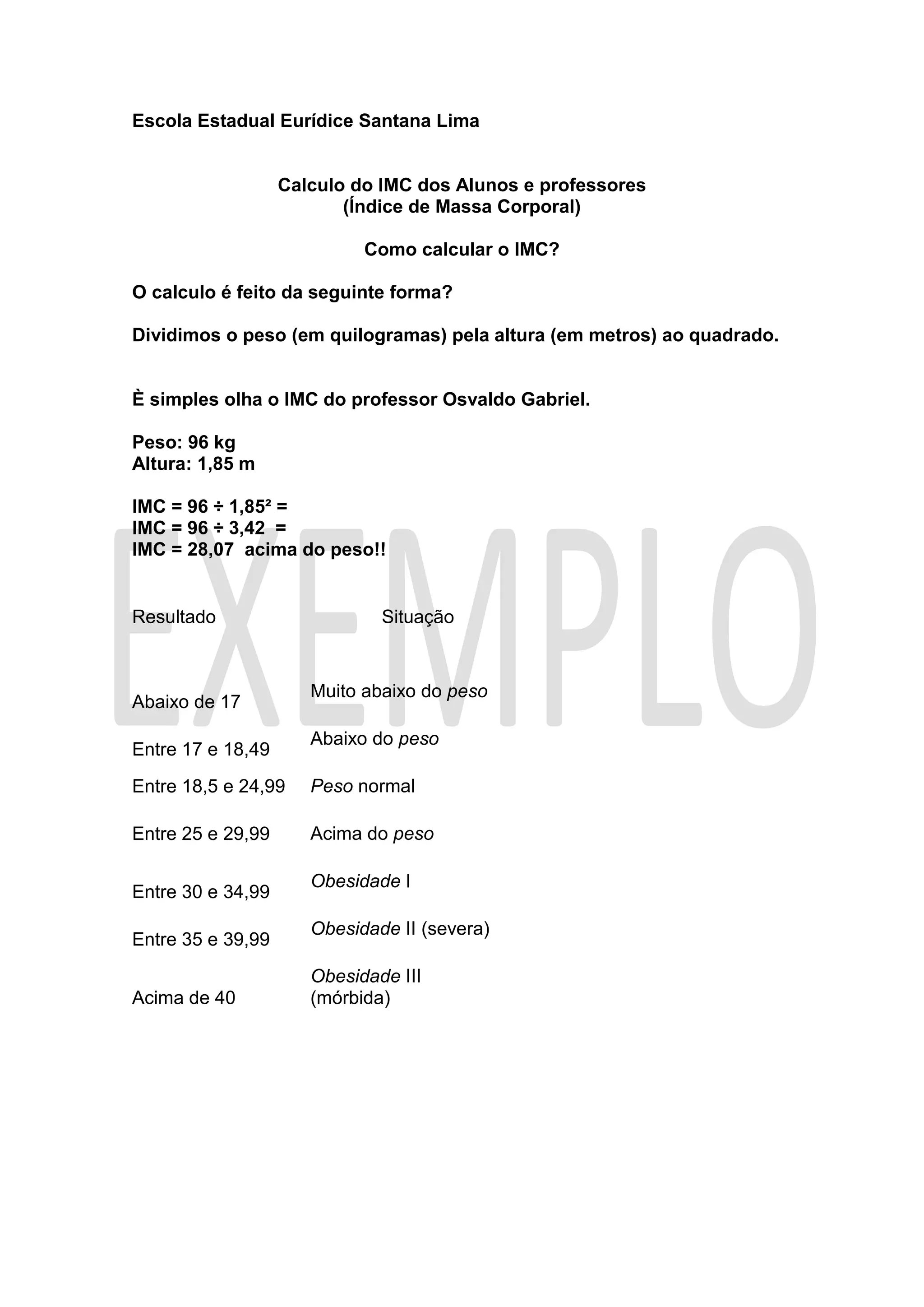 O documento descreve como calcular o Índice de Massa Corporal (IMC) dividindo o peso pela altura ao quadrado e fornece um exemplo do cálculo do IMC de um professor com 96kg e 1,85m de altura, resultando em 28,07 o que indica estar acima do peso. O texto também lista faixas de IMC e situações correspondentes.