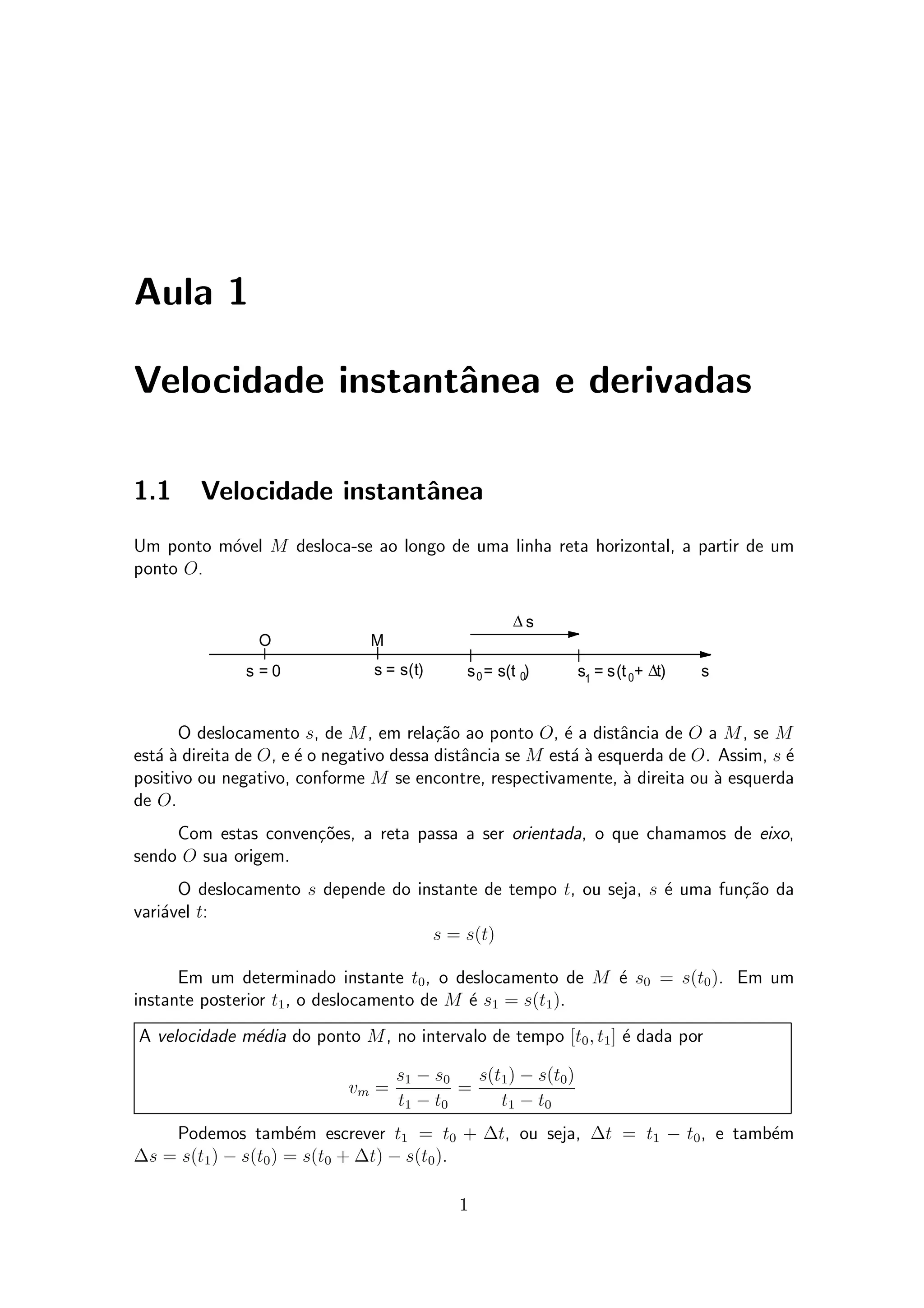 1) O documento discute velocidade instantânea e derivadas. É introduzida a noção de velocidade instantânea como o limite da velocidade média quando o intervalo de tempo tende a zero.