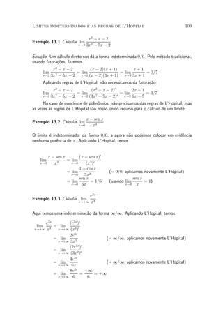 O documento discute regras de L'Hôpital para calcular limites indeterminados na forma 0=0 ou 1=1 usando derivadas. Apresenta exemplos de aplicação das regras para cálculo de limites envolvendo funções exponenciais, logarítmicas e trigonométricas. Discutem-se também novas formas indeterminadas como 00, 10 e 11 e procedimentos para lidar com esses casos.