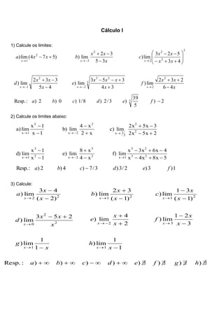O documento apresenta exercícios de cálculo de limites de funções. Inclui limites laterais, limites envolvendo infinitos e limites de funções racionais.