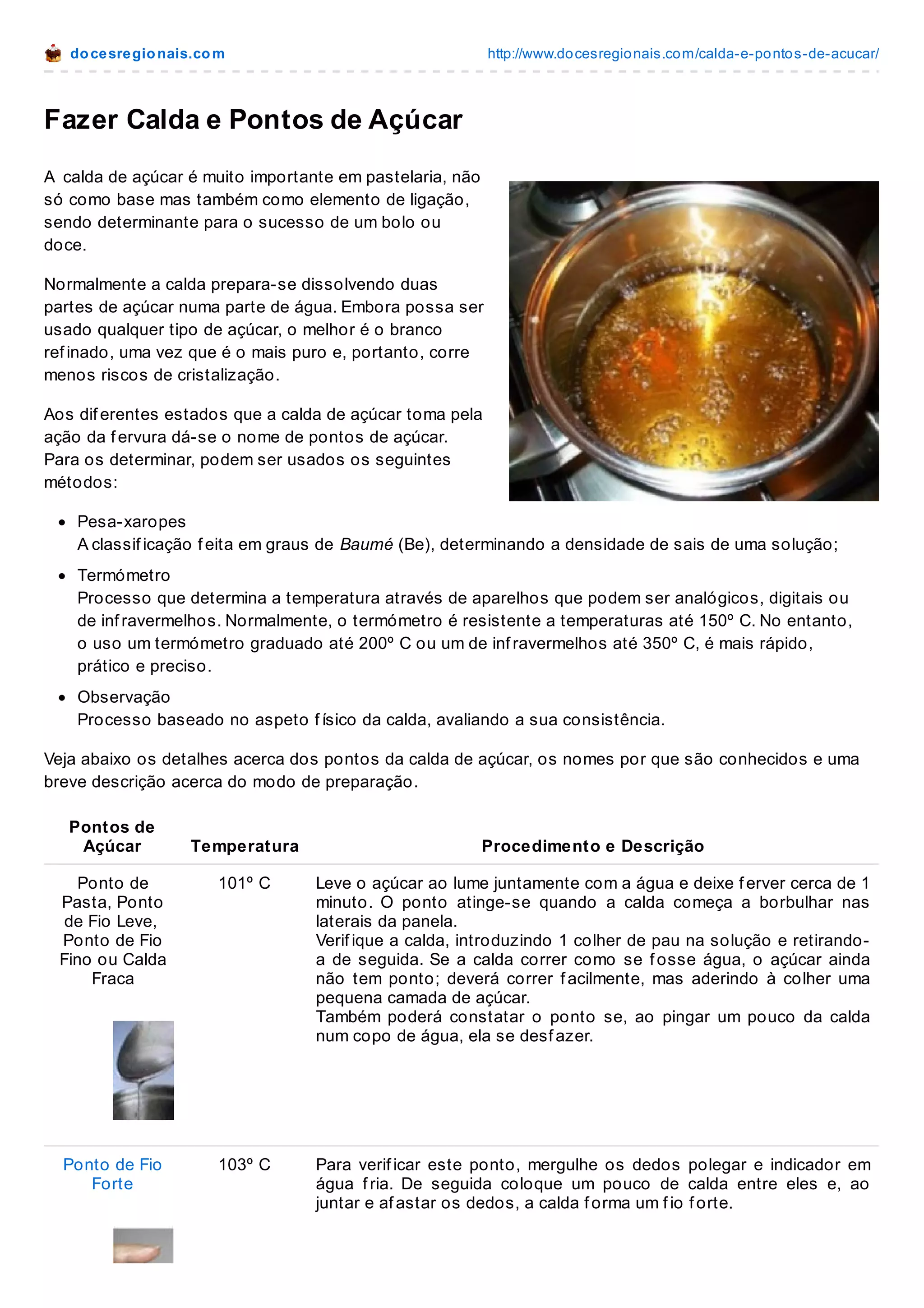 Este documento fornece instruções sobre como fazer calda de açúcar e identificar seus diferentes pontos de cozimento. Explica que a calda é importante em pastelaria e lista os métodos para determinar seus pontos, incluindo termômetro e observação. Em seguida, detalha cada ponto de calda com sua temperatura, procedimento e descrição.