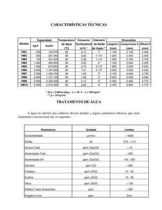 1) A caldeira fumotubular queima lenha em toras e possui fornalha e cinzeiro integrados com três passagens de gases quentes.