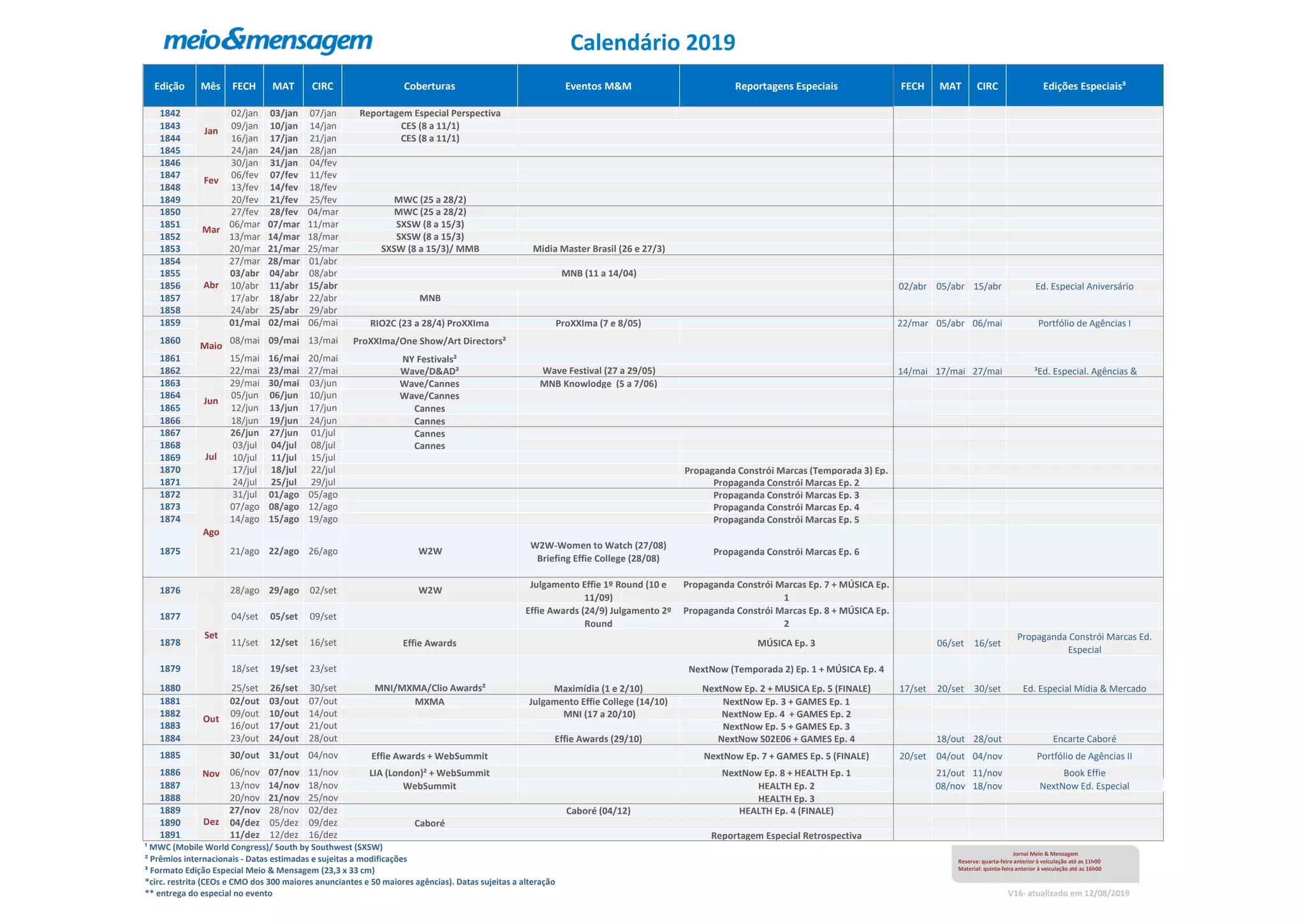 O documento apresenta o calendário editorial de 2019 do jornal Meio & Mensagem, com as datas de fechamento, circulação e eventos cobertos em cada edição. A programação inclui reportagens especiais sobre grandes eventos da indústria como CES, MWC, SXSW, entre outros, além de séries originais como "Propaganda Constrói Marcas" e edições comemorativas.