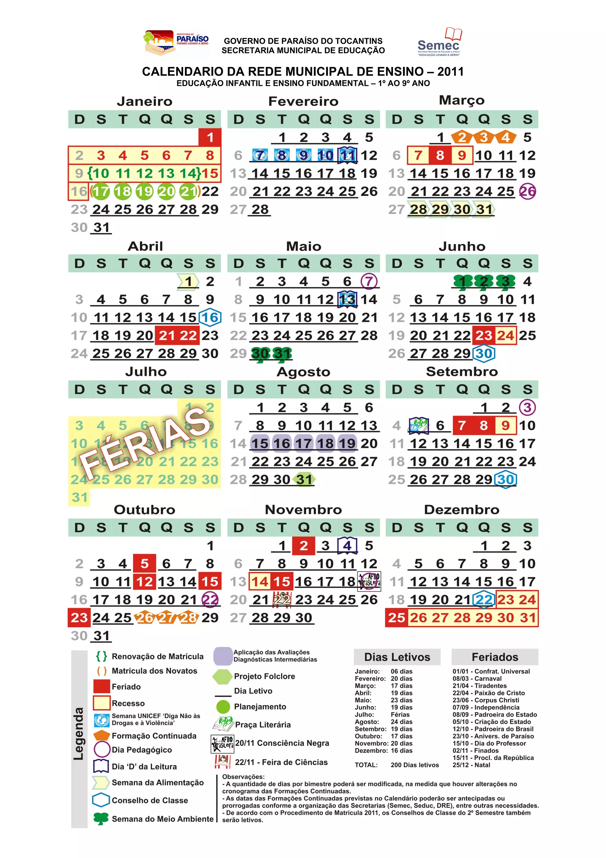 O calendário escolar de 2011 para educação infantil e ensino fundamental de 1o ao 9o ano em Paraíso do Tocantins estabelece as datas de início e término do ano letivo, feriados e recessos escolares.