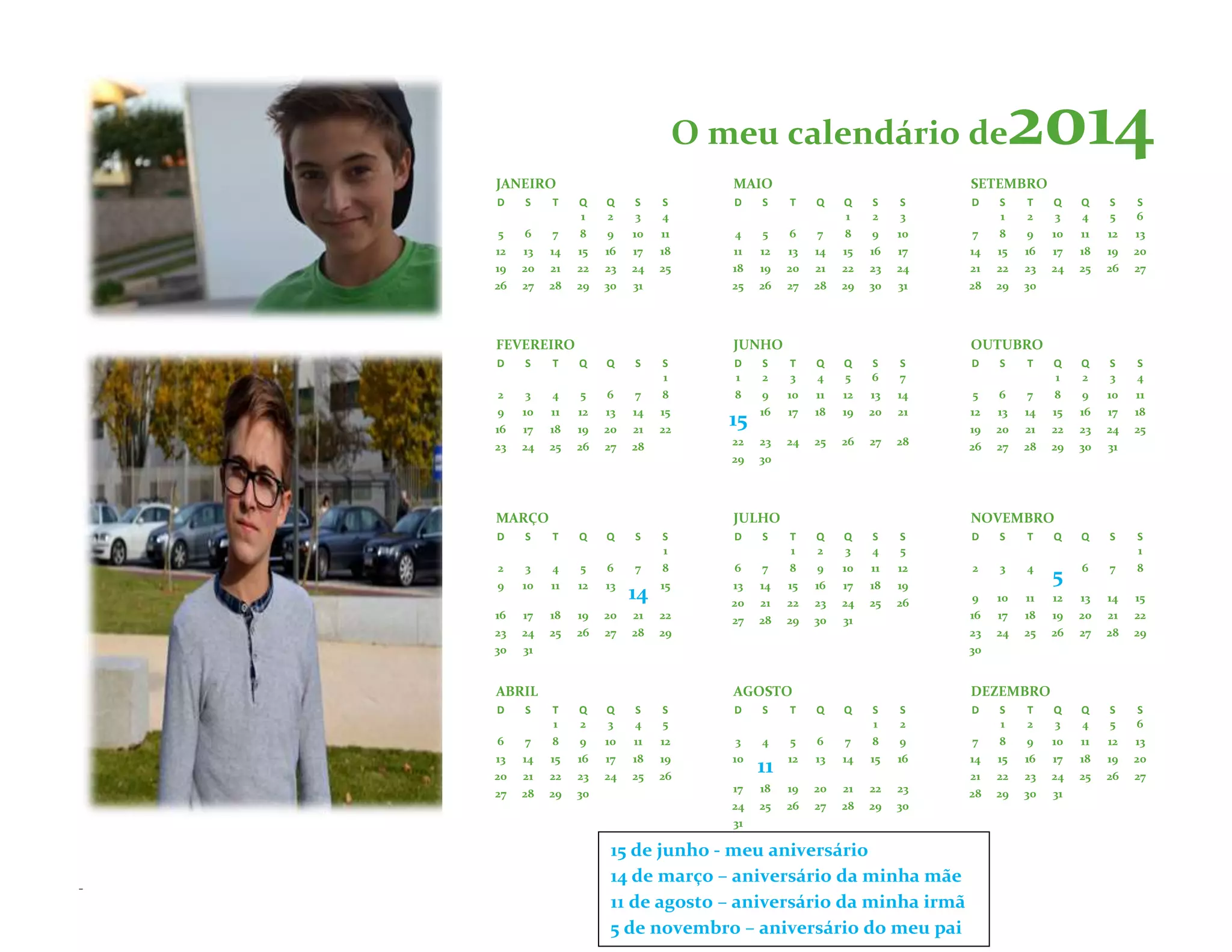 Este documento apresenta o calendário de 2014 da pessoa com os dias da semana em abreviaturas e as datas importantes do ano marcadas, incluindo seu aniversário em 15 de junho, o aniversário de sua mãe em 14 de março, o aniversário de sua irmã em 11 de agosto e o aniversário de seu pai em 5 de novembro.
